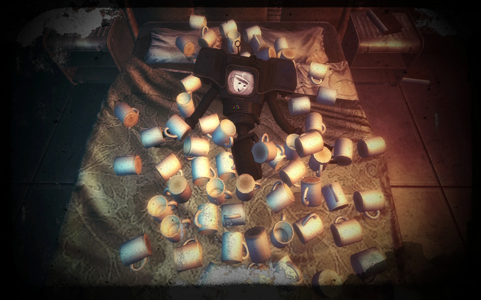 Muggy did his best to collect coffee cups, although in his quest, he accidentally trapped himself in Higgs' Village. It might have been the end for poor Muggy. Except... he found it peaceful there, tidying up the kitchens of the Think Tank Professors back when they had been flesh and bone. Well, except for Dr. O, who was an asshole for having created Muggy in the first place. Muggy left O's house deliberately dirty, punishing the dishes and cups that lived there in blind revenge for serving Dr. O.